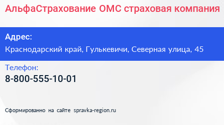 АльфаСтрахование-ОМС, страховая компания по адресу Краснодарский край, Гулькевичи, Северная улица, 45 в дальнейшем Организация, размещена в следующих категориях: