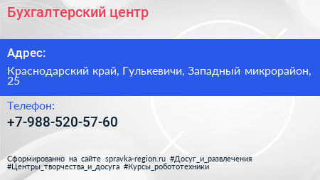 Бухгалтерский центр по адресу Краснодарский край, Гулькевичи, Западный микрорайон, 25 в дальнейшем Организация, размещена в следующих категориях: