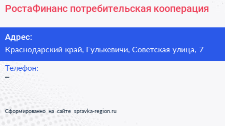 РостаФинанс, потребительская кооперация по адресу Краснодарский край, Гулькевичи, Советская улица, 7 в дальнейшем Организация, размещена в следующих категориях: