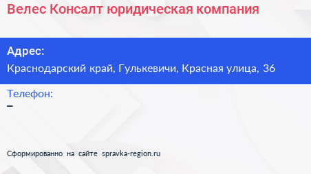 Велес Консалт, юридическая компания по адресу Краснодарский край, Гулькевичи, Красная улица, 36 в дальнейшем Организация, размещена в следующих категориях:
