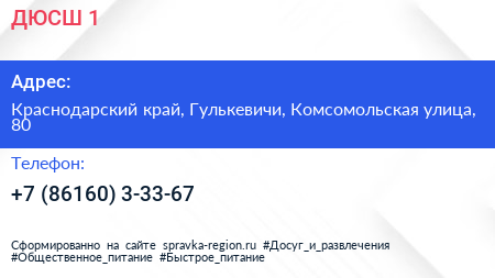 ДЮСШ №1 по адресу Краснодарский край, Гулькевичи, Комсомольская улица, 80 в дальнейшем Организация, размещена в следующих категориях: