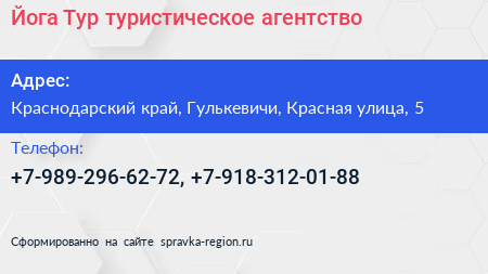 Йога Тур, туристическое агентство по адресу Краснодарский край, Гулькевичи, Красная улица, 5 в дальнейшем Организация, размещена в следующих категориях: