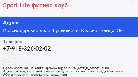 Sport Life, фитнес-клуб по адресу Краснодарский край, Гулькевичи, Красная улица, 36 в дальнейшем Организация, размещена в следующих категориях: