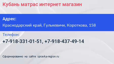 Кубань-матрас, интернет-магазин по адресу Краснодарский край, Гулькевичи, Короткова, 158 в дальнейшем Организация, размещена в следующих категориях: