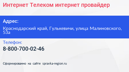 Интернет Телеком, интернет-провайдер по адресу Краснодарский край, Гулькевичи, улица Малиновского, 53а в дальнейшем Организация, размещена в следующих категориях: