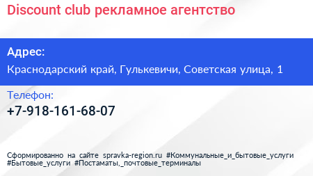 Discount club, рекламное агентство по адресу Краснодарский край, Гулькевичи, Советская улица, 1 в дальнейшем Организация, размещена в следующих категориях: