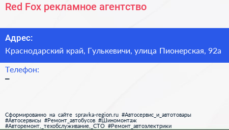 Red Fox, рекламное агентство по адресу Краснодарский край, Гулькевичи, улица Пионерская, 92а в дальнейшем Организация, размещена в следующих категориях: