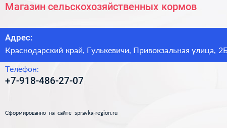 Магазин сельскохозяйственных кормов по адресу Краснодарский край, Гулькевичи, Привокзальная улица, 2Б в дальнейшем Организация, размещена в следующих категориях: