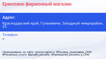 Ермолино, фирменный магазин по адресу Краснодарский край, Гулькевичи, Западный микрорайон, 25 в дальнейшем Организация, размещена в следующих категориях: