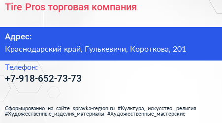 Tire Pros, торговая компания по адресу Краснодарский край, Гулькевичи, Короткова, 201 в дальнейшем Организация, размещена в следующих категориях: