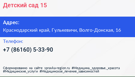Детский сад №15 по адресу Краснодарский край, Гулькевичи, Волго-Донская, 16 в дальнейшем Организация, размещена в следующих категориях: