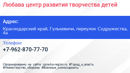 Любава, центр развития творчества детей по адресу Краснодарский край, Гулькевичи, переулок Содружества, 4а в дальнейшем Организация, размещена в следующих категориях: