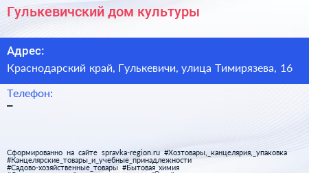 Гулькевичский дом культуры по адресу Краснодарский край, Гулькевичи, улица Тимирязева, 16 в дальнейшем Организация, размещена в следующих категориях: