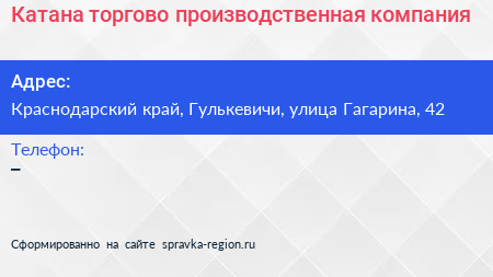 Катана, торгово-производственная компания по адресу Краснодарский край, Гулькевичи, улица Гагарина, 42 в дальнейшем Организация, размещена в следующих категориях: