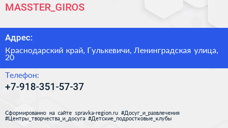 MASSTER_GIROS по адресу Краснодарский край, Гулькевичи, Ленинградская улица, 20 в дальнейшем Организация, размещена в следующих категориях: