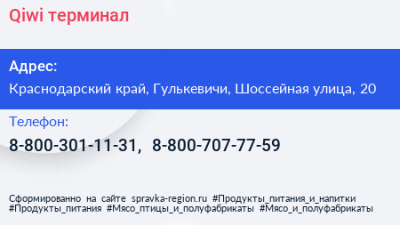 Qiwi, терминал по адресу Краснодарский край, Гулькевичи, Шоссейная улица, 20 в дальнейшем Организация, размещена в следующих категориях: