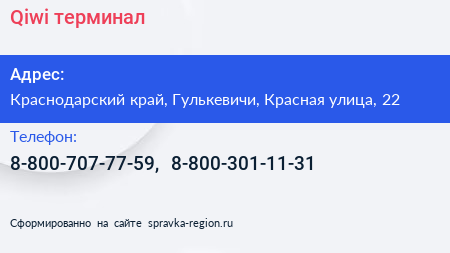 Qiwi, терминал по адресу Краснодарский край, Гулькевичи, Красная улица, 22 в дальнейшем Организация, размещена в следующих категориях: