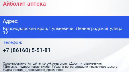 Айболит, аптека по адресу Краснодарский край, Гулькевичи, Ленинградская улица, 19 в дальнейшем Организация, размещена в следующих категориях: