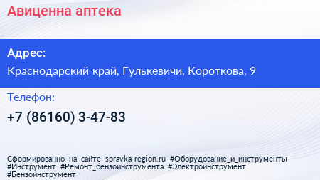 Авиценна, аптека по адресу Краснодарский край, Гулькевичи, Короткова, 9 в дальнейшем Организация, размещена в следующих категориях: