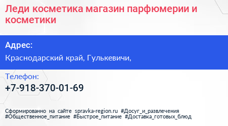 Леди косметика, магазин парфюмерии и косметики по адресу Краснодарский край, Гулькевичи, в дальнейшем Организация, размещена в следующих категориях: