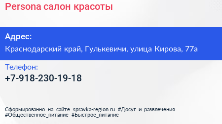 Persona, салон красоты по адресу Краснодарский край, Гулькевичи, улица Кирова, 77а в дальнейшем Организация, размещена в следующих категориях: