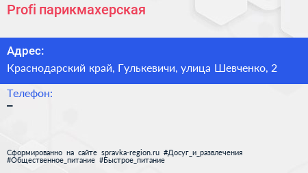 Profi, парикмахерская по адресу Краснодарский край, Гулькевичи, улица Шевченко, 2 в дальнейшем Организация, размещена в следующих категориях:
