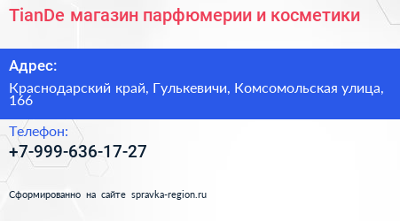 TianDe, магазин парфюмерии и косметики по адресу Краснодарский край, Гулькевичи, Комсомольская улица, 166 в дальнейшем Организация, размещена в следующих категориях: