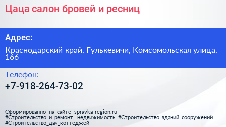 Цаца, салон бровей и ресниц по адресу Краснодарский край, Гулькевичи, Комсомольская улица, 166 в дальнейшем Организация, размещена в следующих категориях: