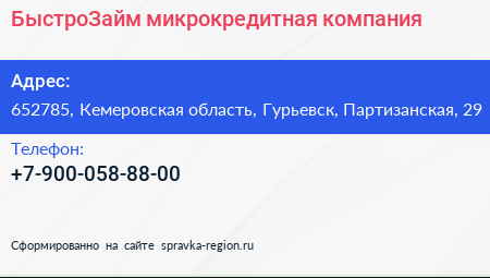 БыстроЗайм, микрокредитная компания по адресу 652785, Кемеровская область, Гурьевск, Партизанская, 29 в дальнейшем Организация, размещена в следующих категориях: