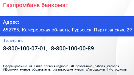 Газпромбанк, банкомат по адресу 652785, Кемеровская область, Гурьевск, Партизанская, 29 в дальнейшем Организация, размещена в следующих категориях: