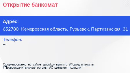 Открытие, банкомат по адресу 652780, Кемеровская область, Гурьевск, Партизанская, 31 в дальнейшем Организация, размещена в следующих категориях: