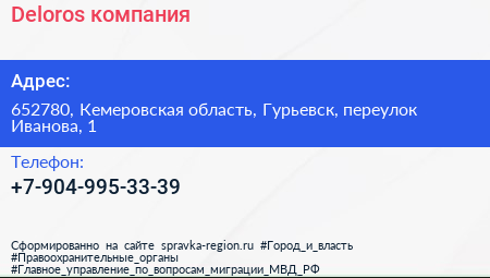 Deloros, компания по адресу 652780, Кемеровская область, Гурьевск, переулок Иванова, 1 в дальнейшем Организация, размещена в следующих категориях: