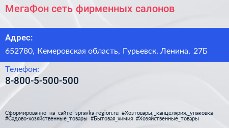 МегаФон, сеть фирменных салонов по адресу 652780, Кемеровская область, Гурьевск, Ленина, 27Б в дальнейшем Организация, размещена в следующих категориях: