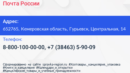 Почта России по адресу 652765, Кемеровская область, Гурьевск, Центральная, 14 в дальнейшем Организация, размещена в следующих категориях: