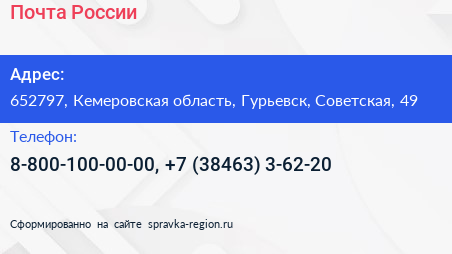 Почта России по адресу 652797, Кемеровская область, Гурьевск, Советская, 49 в дальнейшем Организация, размещена в следующих категориях: