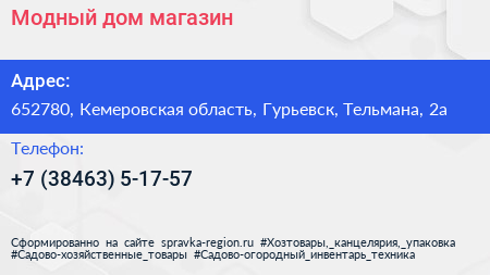 Модный дом, магазин по адресу 652780, Кемеровская область, Гурьевск, Тельмана, 2а в дальнейшем Организация, размещена в следующих категориях: