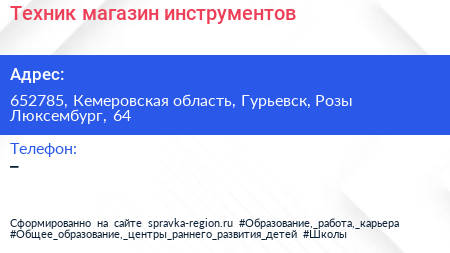 Техник, магазин инструментов по адресу 652785, Кемеровская область, Гурьевск, Розы Люксембург, 64 в дальнейшем Организация, размещена в следующих категориях: