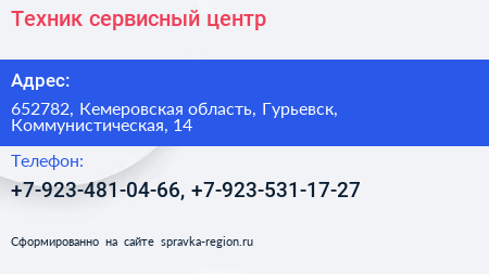 Техник, сервисный центр по адресу 652782, Кемеровская область, Гурьевск, Коммунистическая, 14 в дальнейшем Организация, размещена в следующих категориях: