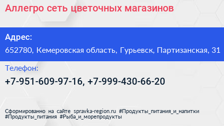 Аллегро, сеть цветочных магазинов по адресу 652780, Кемеровская область, Гурьевск, Партизанская, 31 в дальнейшем Организация, размещена в следующих категориях: