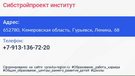 Сибстройпроект, институт по адресу 652780, Кемеровская область, Гурьевск, Ленина, 68 в дальнейшем Организация, размещена в следующих категориях: