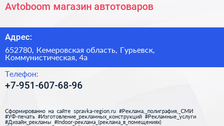 Avtoboom, магазин автотоваров по адресу 652780, Кемеровская область, Гурьевск, Коммунистическая, 4а в дальнейшем Организация, размещена в следующих категориях: