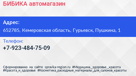 БИБИКА, автомагазин по адресу 652785, Кемеровская область, Гурьевск, Пушкина, 1 в дальнейшем Организация, размещена в следующих категориях: