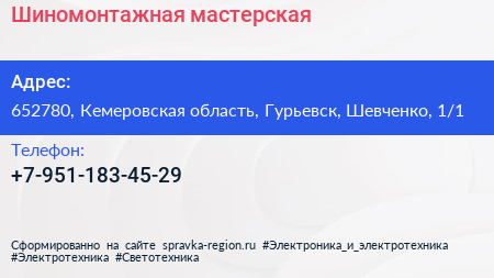 Шиномонтажная мастерская по адресу 652780, Кемеровская область, Гурьевск, Шевченко, 1/1 в дальнейшем Организация, размещена в следующих категориях: