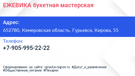ЕЖЕВИКА, букетная мастерская по адресу 652780, Кемеровская область, Гурьевск, Кирова, 55 в дальнейшем Организация, размещена в следующих категориях: