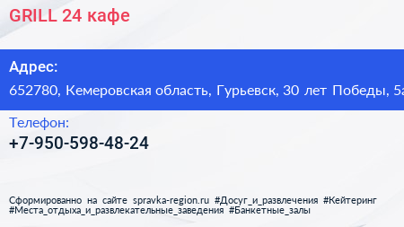 GRILL#24, кафе по адресу 652780, Кемеровская область, Гурьевск, 30 лет Победы, 5а в дальнейшем Организация, размещена в следующих категориях: