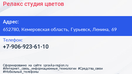 Релакс, студия цветов по адресу 652780, Кемеровская область, Гурьевск, Ленина, 69 в дальнейшем Организация, размещена в следующих категориях: