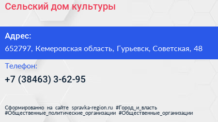 Сельский дом культуры по адресу 652797, Кемеровская область, Гурьевск, Советская, 48 в дальнейшем Организация, размещена в следующих категориях: