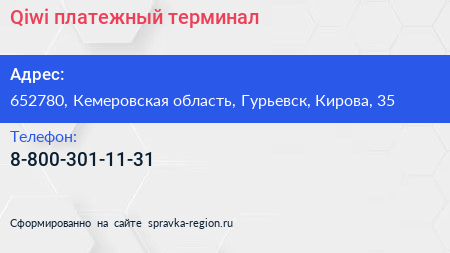 Qiwi, платежный терминал по адресу 652780, Кемеровская область, Гурьевск, Кирова, 35 в дальнейшем Организация, размещена в следующих категориях: