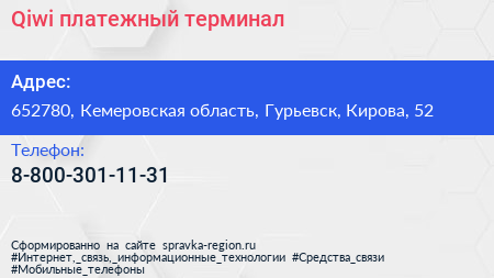 Qiwi, платежный терминал по адресу 652780, Кемеровская область, Гурьевск, Кирова, 52 в дальнейшем Организация, размещена в следующих категориях: