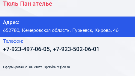 Тюль-Пан, ателье по адресу 652780, Кемеровская область, Гурьевск, Кирова, 46 в дальнейшем Организация, размещена в следующих категориях: